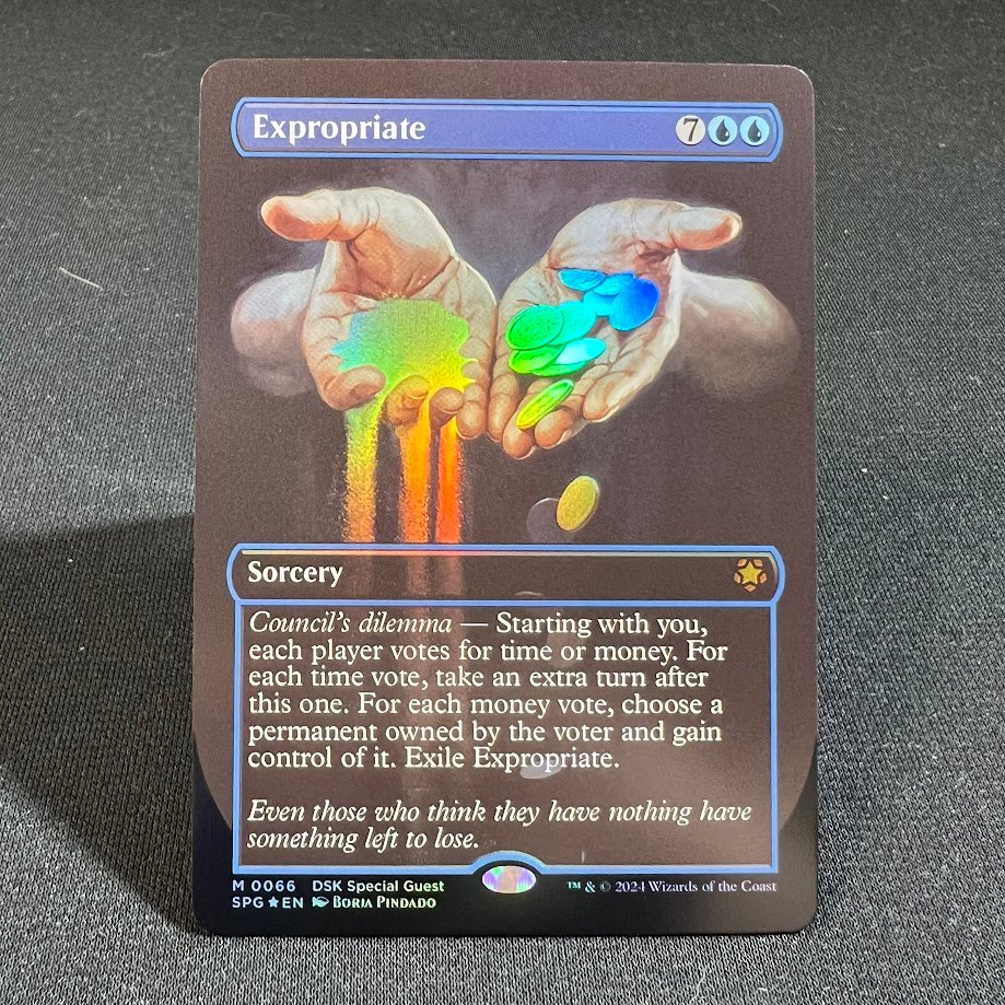 This is a high quality Expropriate SPG foil MTG Proxy Cards . We use the latest printing and cutting technology to create a realistic proxy card that you can use at home , in FNM, or even Small Local tournament. My cards will make your deck more competitive at a reasonable price. Great for any formats especially commander.