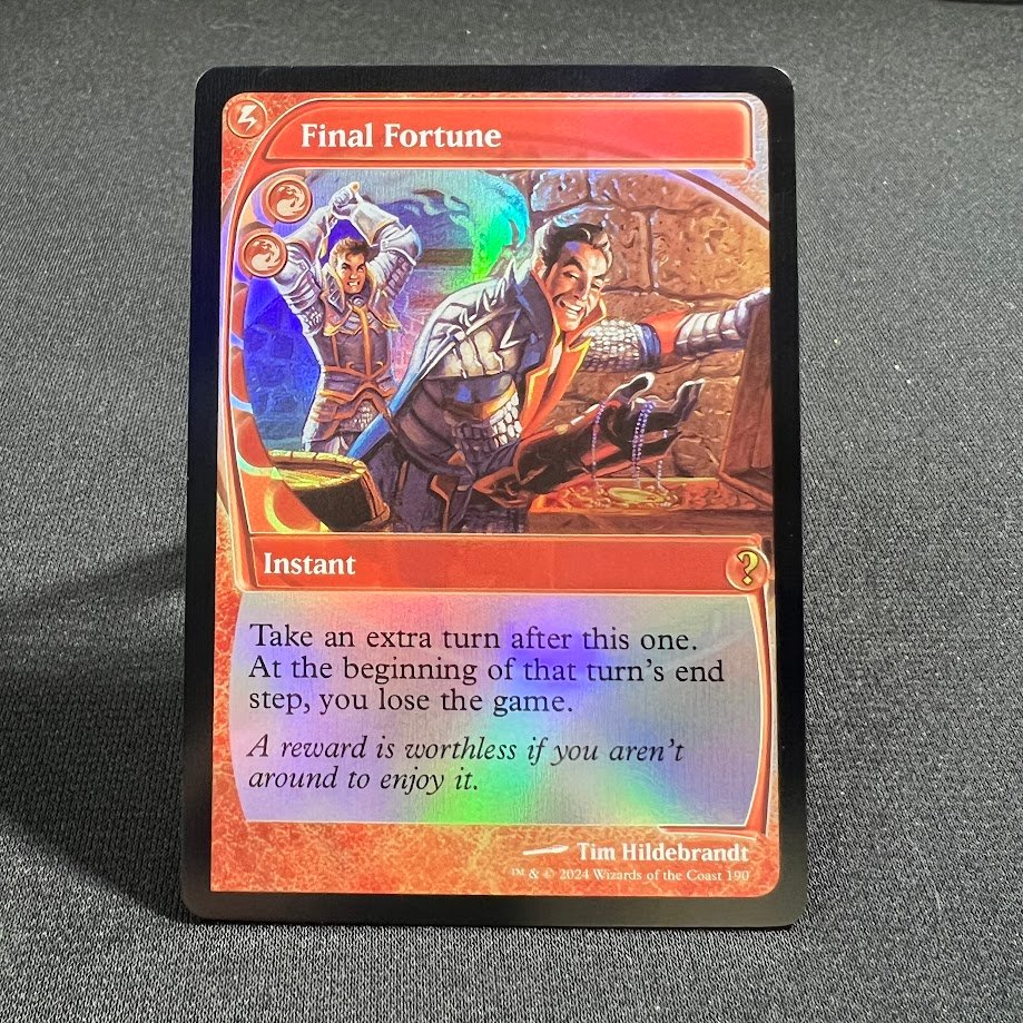 This is a high quality Final Fortune MB2 foil MTG Proxy Cards . We use the latest printing and cutting technology to create a realistic proxy card that you can use at home , in FNM, or even Small Local tournament. My cards will make your deck more competitive at a reasonable price. Great for any formats especially commander.