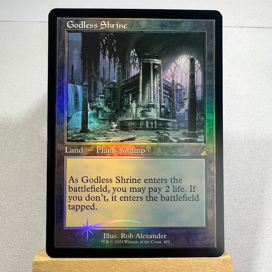 This is a high quality Godless Shrine RVR Old Frame foil MTG Proxy Cards . We use the latest printing and cutting technology to create a realistic proxy card that you can use at home , in FNM, or even Small Local tournament. My cards will make your deck more competitive at a reasonable price. Great for any formats especially commander.