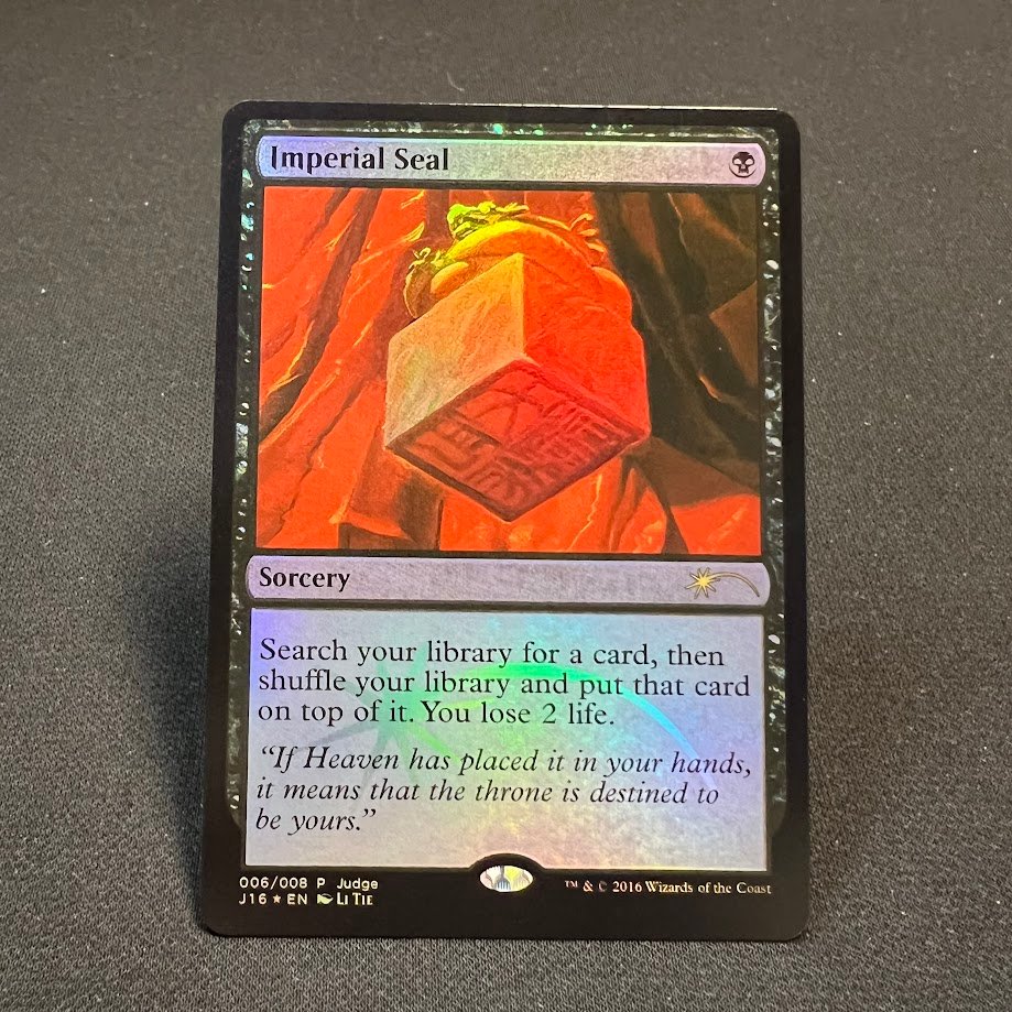 This is a high quality Imperial Seal Judge Gift 2016 Foil MTG Proxy Cards . We use the latest printing and cutting technology to create a realistic proxy card that you can use at home , in FNM, or even Small Local tournament. My cards will make your deck more competitive at a reasonable price. Great for any formats especially commander.